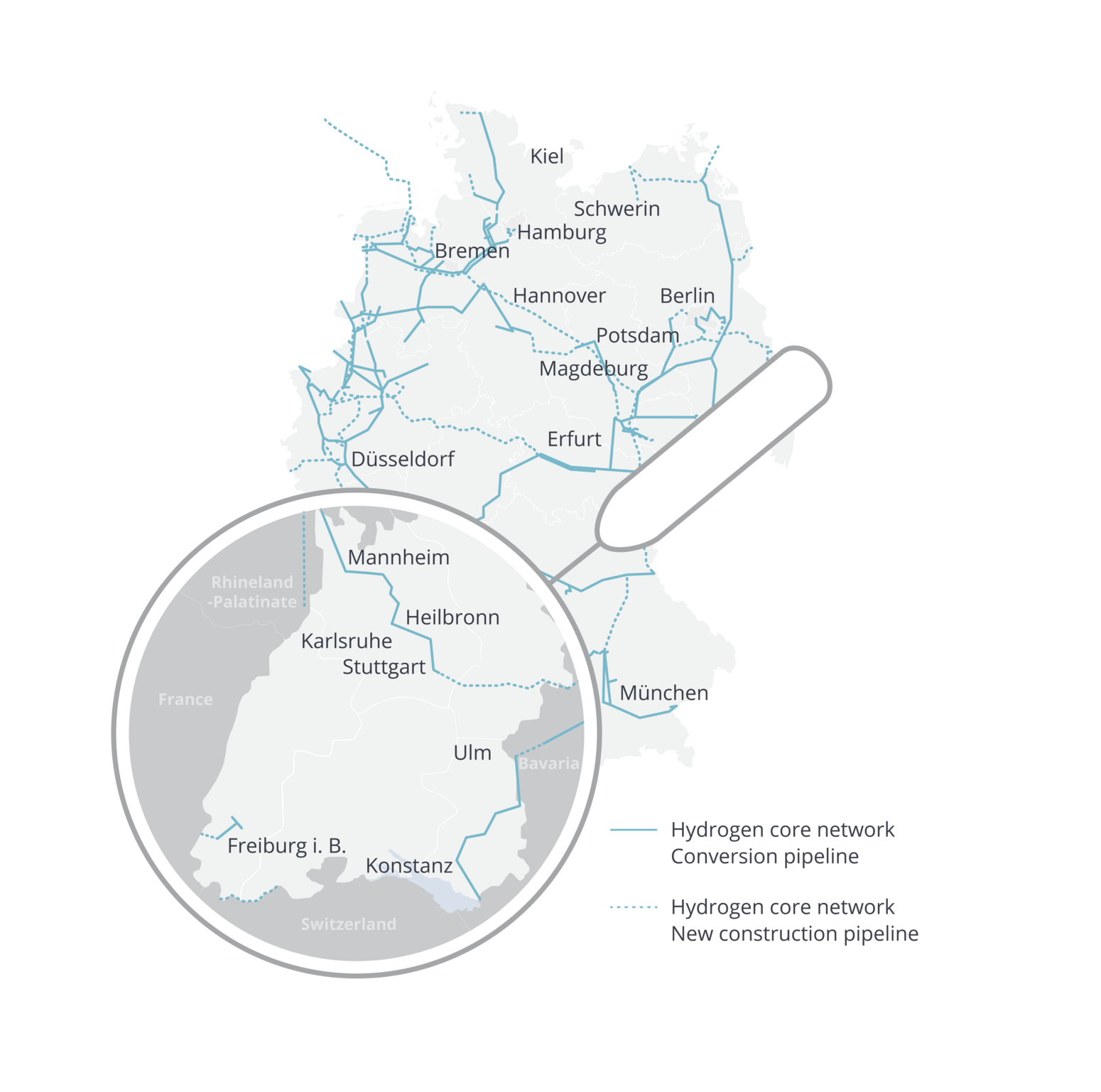 Industrial customers of badenovaNETZE near Freiburg i. B. will be connected by constructing new pipeline to France and repurposing existing gas pipelines. A new, approximately 15-kilometre-long hydrogen pipeline built by terranets bw will create a connection to France and will therefore cross the Rhine between the Fessenheim area on the French side and the Bad Krozingen area on the German side. The newly constructed pipeline will be connected to an existing, approx. 20-kilometre-long gas pipeline owned and operated by terranets bw that stretches to March-Buchheim. This pipeline will be repurposed for transporting hydrogen. Customers will be connected via the badenovaNETZE network in the Freiburg i. B area.